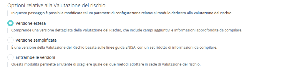 Nel menù di configurazione è possibile attivare la possibilità di condurre una valutazione del rischio semplificata nel contesto delle attività di trattamento o delle valutazioni d’impatto.