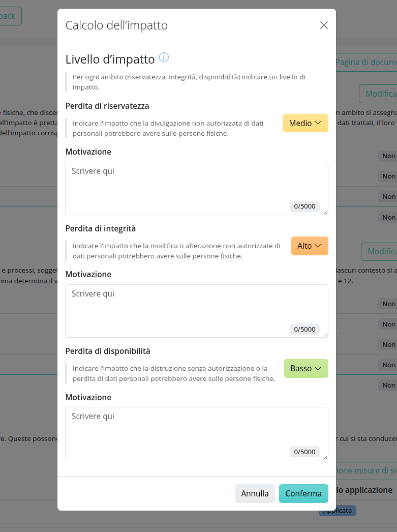 Assegnare un livello di mitigazione: cliccando sul bottone «Modifica» è possibile accedere alla schermata in cui modificare il livello di mitigazione del rischio (relativamente a probabilità e/o impatto) per le singole misure di sicurezza aggiunte. Il livello può essere preimpostato nella sezione Minacce .