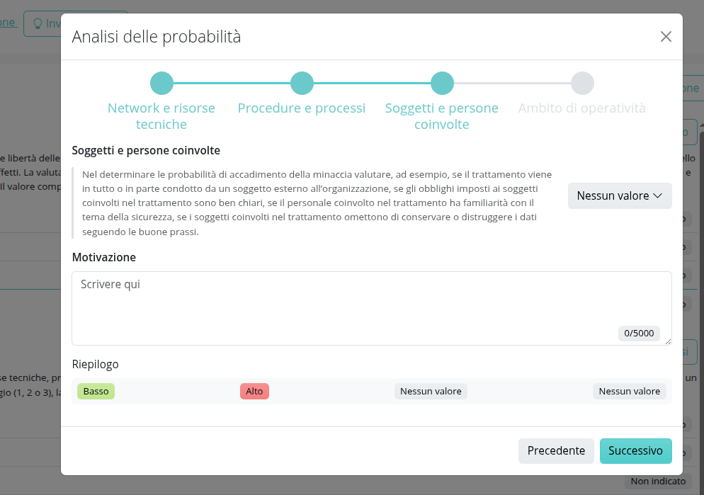 Questo terzo ed ultimo passaggio della valutazione consente, cliccando sull’apposito bottone «Modifica», di sugellare la valutazione condotta con delle considerazioni sul rischio residuo finale, indicando ad esempio le ragioni che sottendono l’accettazione dello stesso. Cliccato sul bottone «Modifica», comparirà una modale con all’interno una casella di testo nella quale indicare le considerazioni sul rischio finale. Cliccando su «Salva e procedi» il contenuto verrà poi definitivamente aggiunto all’analisi.